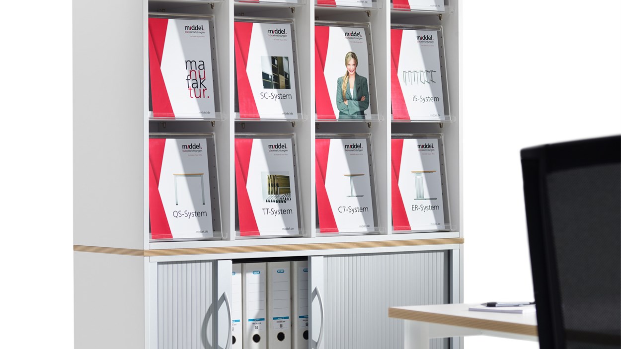 Klappenschränke bzw. Prospektschränke eigenen sich ideal, um Prospekte, Verkaufsbroschüren oder Flyer Ihres Unternehemns zu verstauen und diese dem Leser im richtigen Winkel zu präsentieren.