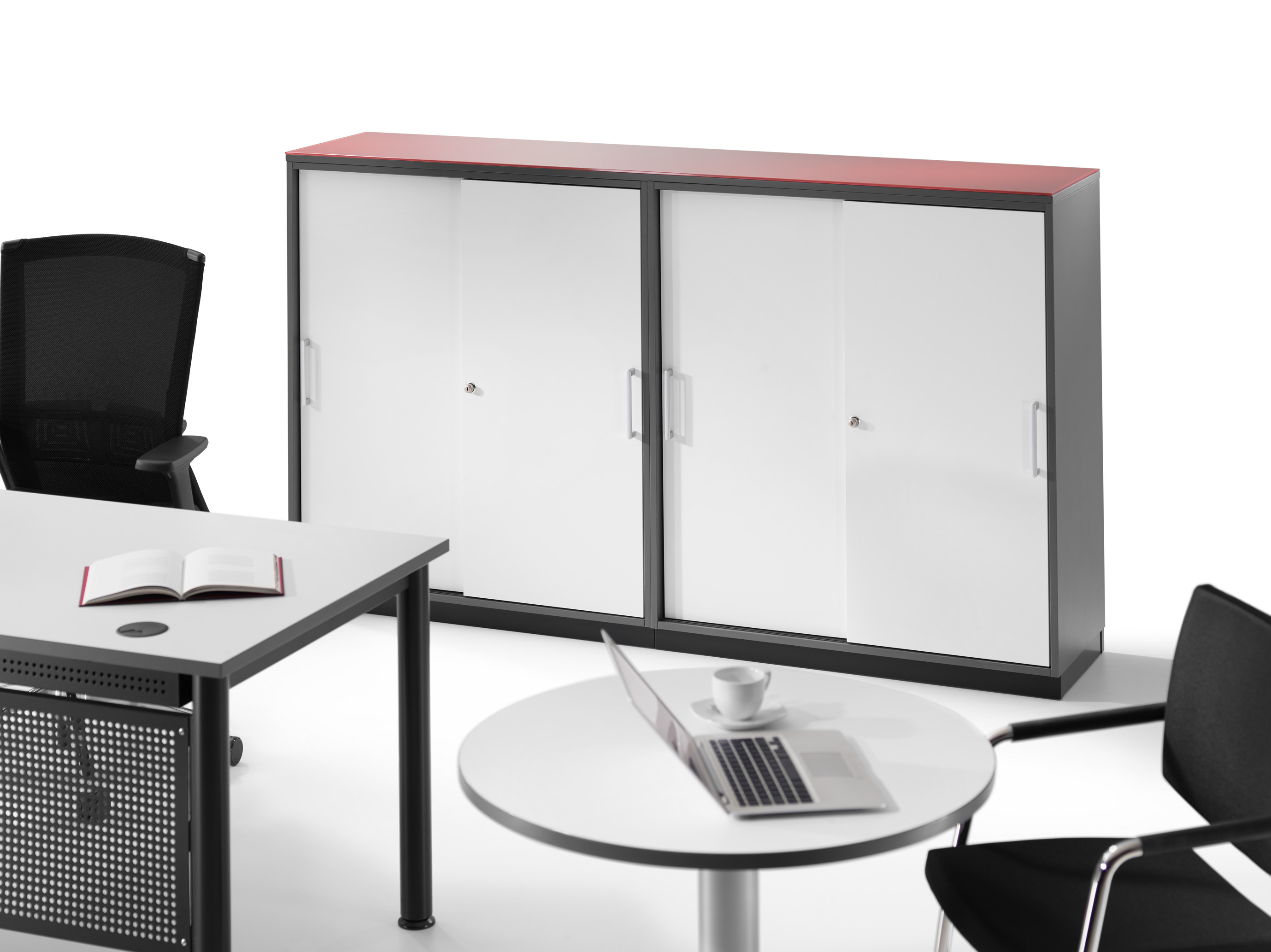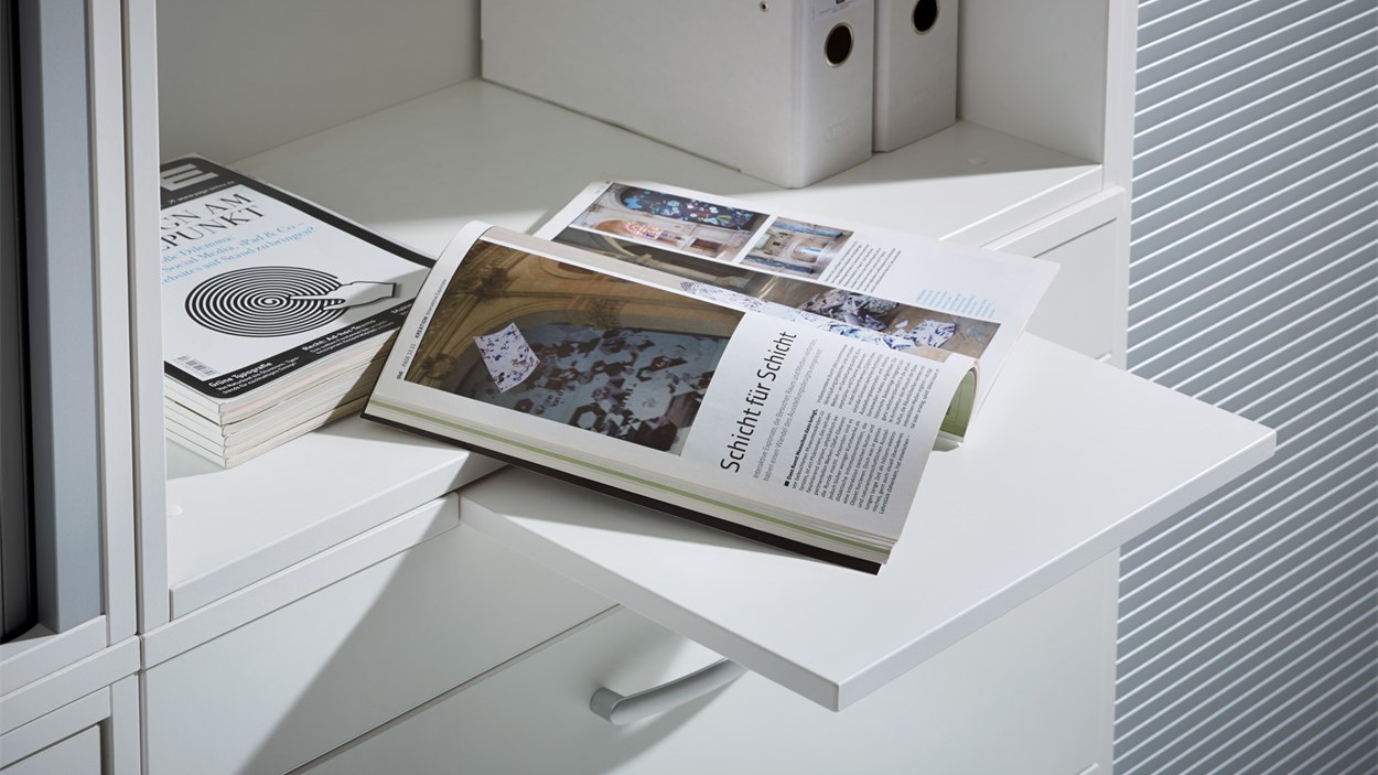 Querrollladenschränke schaffen auch in kleinen Büros großzügigen Stauraum, da die Rollladen platzsparend im Schrank verschwinden. Praktische Ausziehbretter ermöglichen eine bequeme Ablage der Ordner.